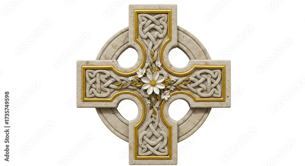 Celtic cross with flowers isolated on transparent background, ancient stone carving with knotwork and floral decoration for religious themes