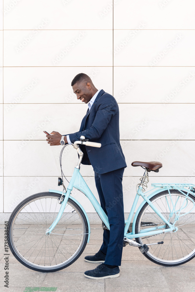 African american businessman using mobile phone while standing with bicycle against a white wall