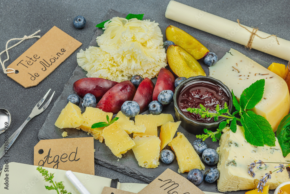 Assorted cheese board with berries, fruits, jams, honey, and a notebook for tasting notes