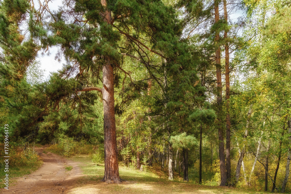 A beautiful pine tree on a bright and sunny day in an autumn forest