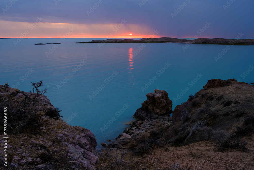 Sunset over Lake Balkhash in Kazakhstan with turquoise water on an autumn evening