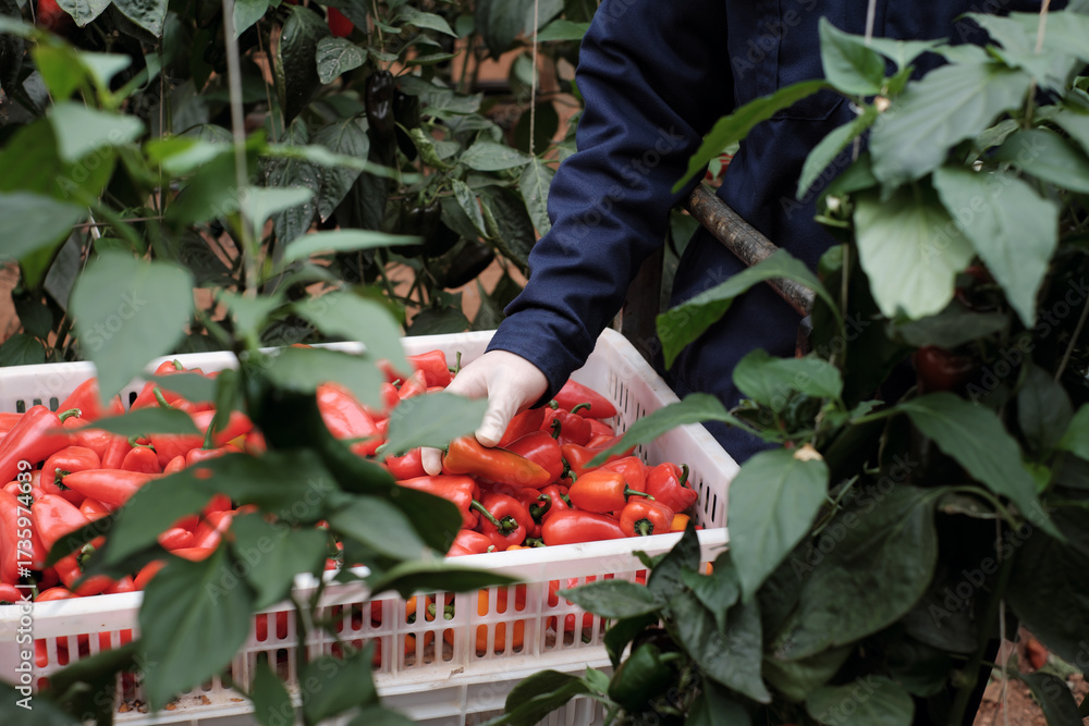 A series of photos capturing a female worker harvesting red, orange sweet peppers, Sweet Palermo by hand at a farm in Da Lat, Vietnam, an agricultural process and fresh produce