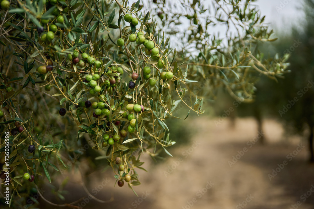 Olive tree branch, young green olives arranged in a row close-up on blurred foliage