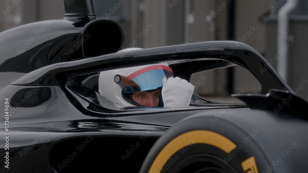 Close-up of a focused pilot driver in a red racing car preparing for a race