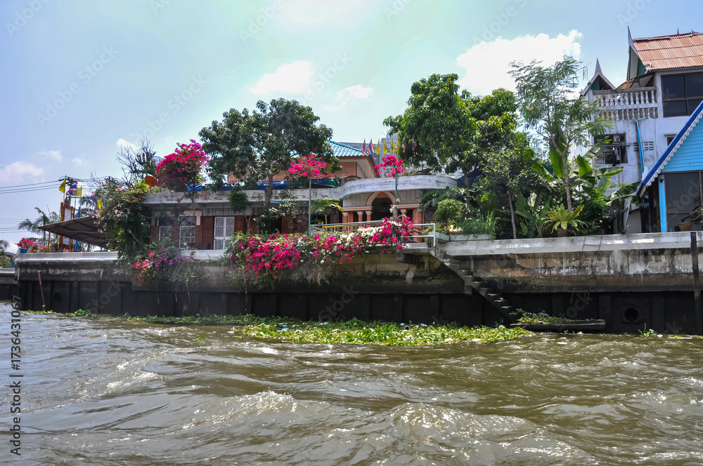 Stilt houses on the Chao Phraya River in Bangkok, Thailand. Contrast of traditional dwellings and a modern skyscraper.