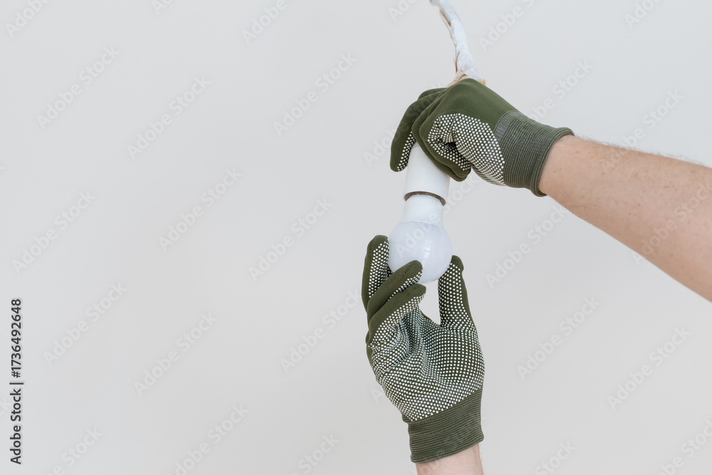 Electrician installing light bulb in new apartment after renovation.