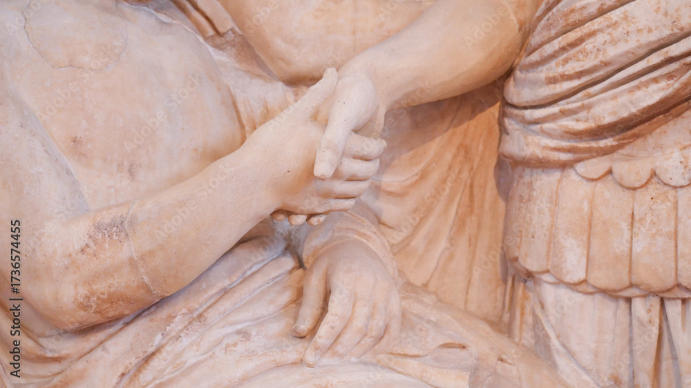 Detail of the handshake between two Greek statues at the National Museum of Greece