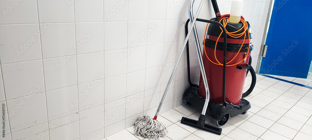 A red industrial vacuum cleaner with a mop and tools in a tiled gym restroom. Concept for hygiene, cleaning, and sanitation.