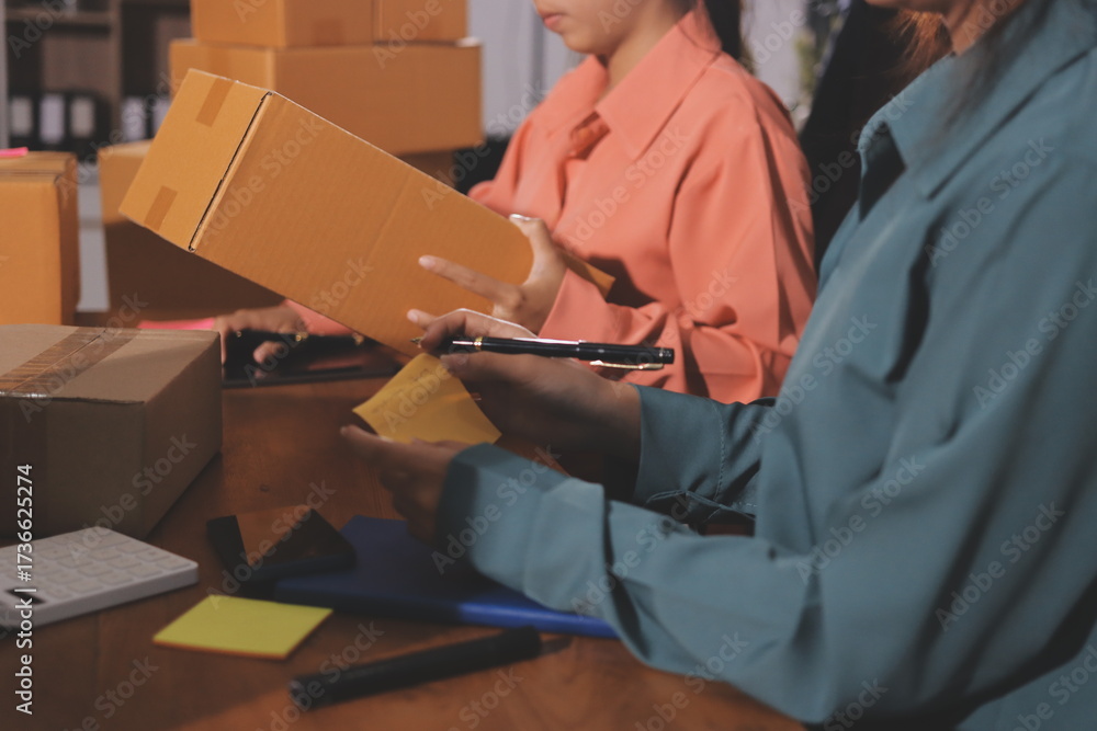 Startup SME small business entrepreneur of freelance Asian woman wearing apron using laptop and box to receive and review orders online to prepare to pack sell to customers, online sme business ideas.