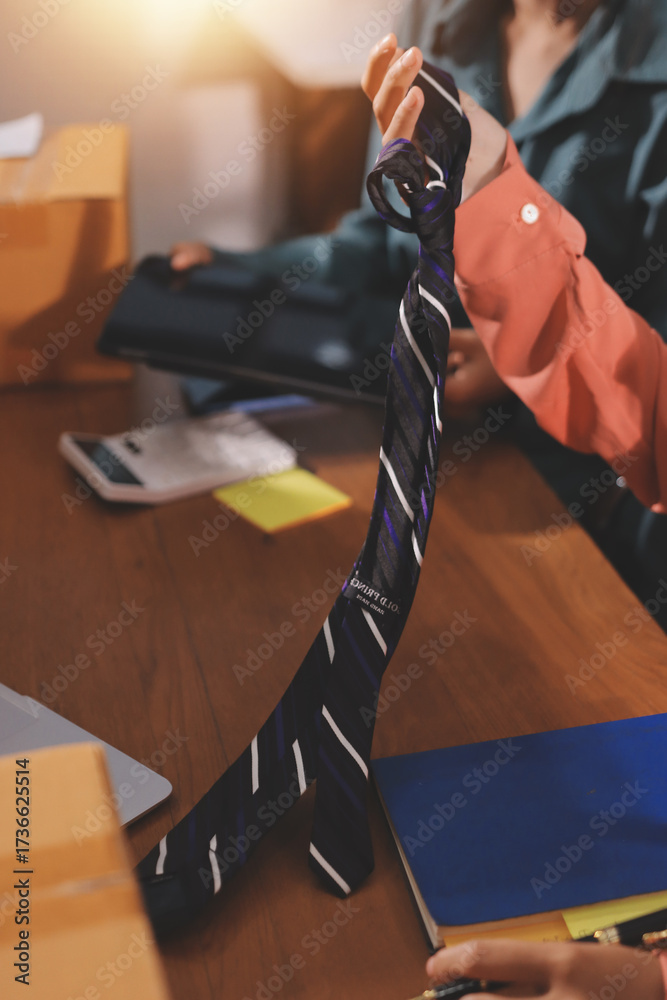 Startup SME small business entrepreneur of freelance Asian woman wearing apron using laptop and box to receive and review orders online to prepare to pack sell to customers, online sme business ideas.