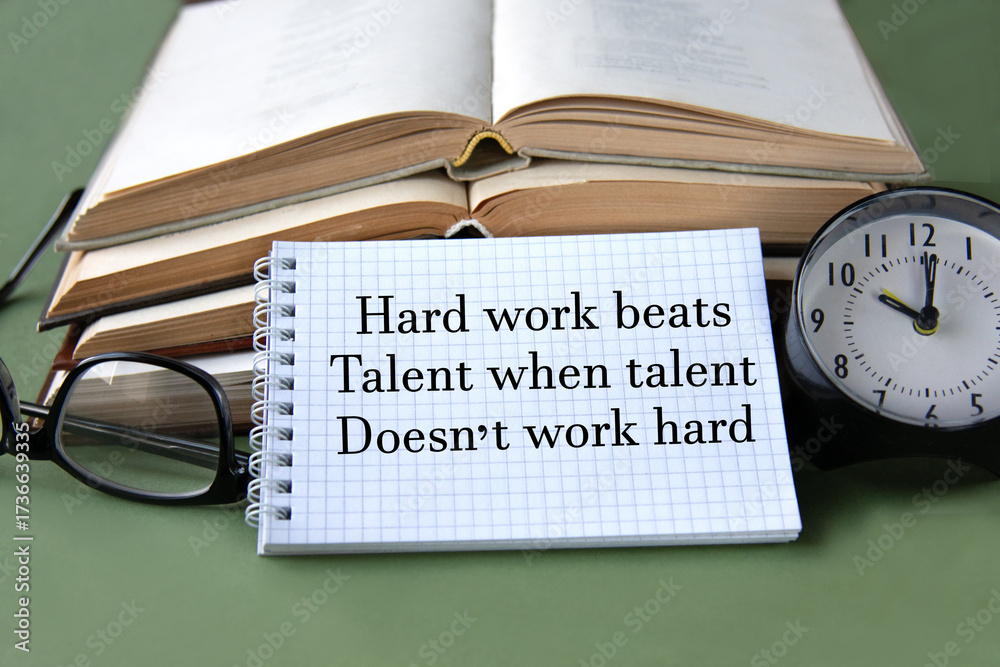 A notebook with the words "HARD WORK CONQUERS TALENT WHEN TALENT DOESN'T WORK HARD" written on it, with books and an alarm clock in the background.