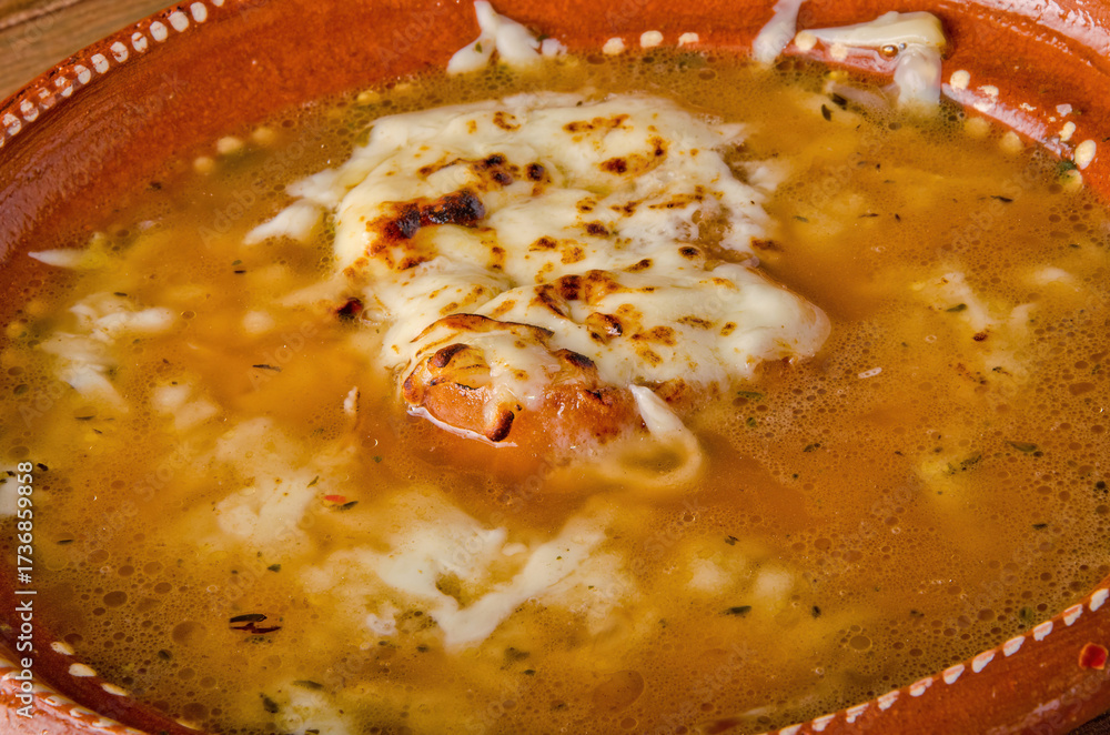 Classic French Onion Soup with Melted Cheese Au Gratin in a Clay Bowl