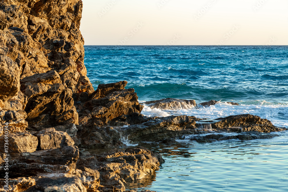 The sea and the cliffs. A natural pool formed in the rocks. The king's pool. A slice of the impressive view of the deep blue Mediterranean.