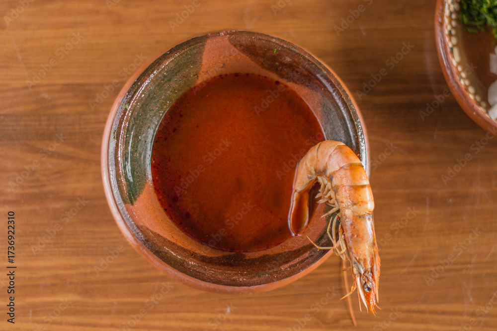 Spicy Mexican Shrimp Soup (Caldo de Camaron) in a Red Chili Broth