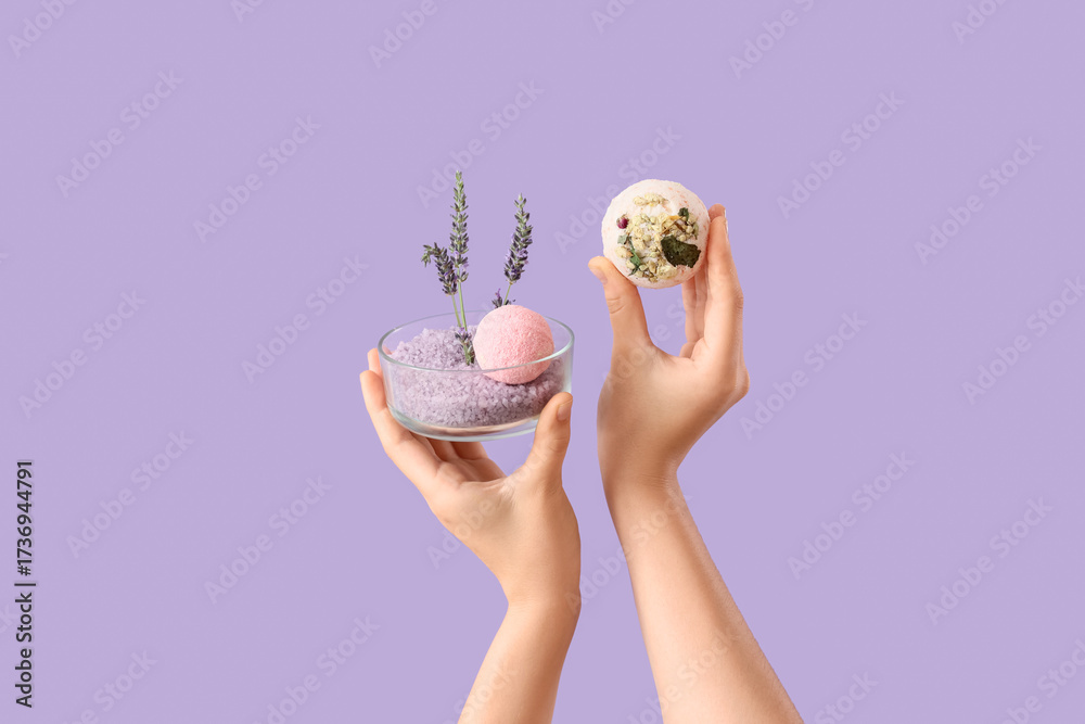 Female hands holding bath bombs and bowl with sea salt on lilac background