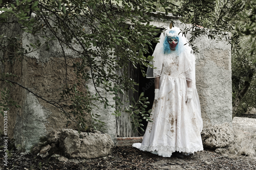 scary evil clown in a bride dress