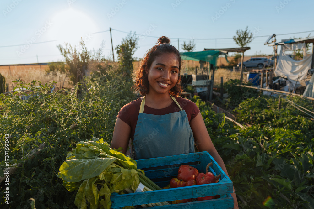 Young farmer woman holding crate of vegetables in her garden