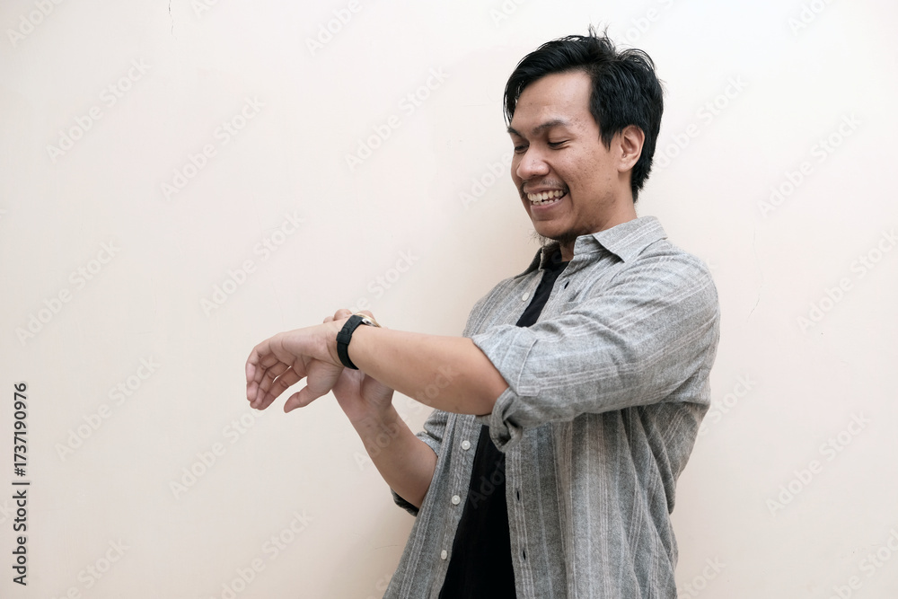 Southeast Asian man wearing flannel shirt holding a watch and smiling happy expression, on white isolated background.