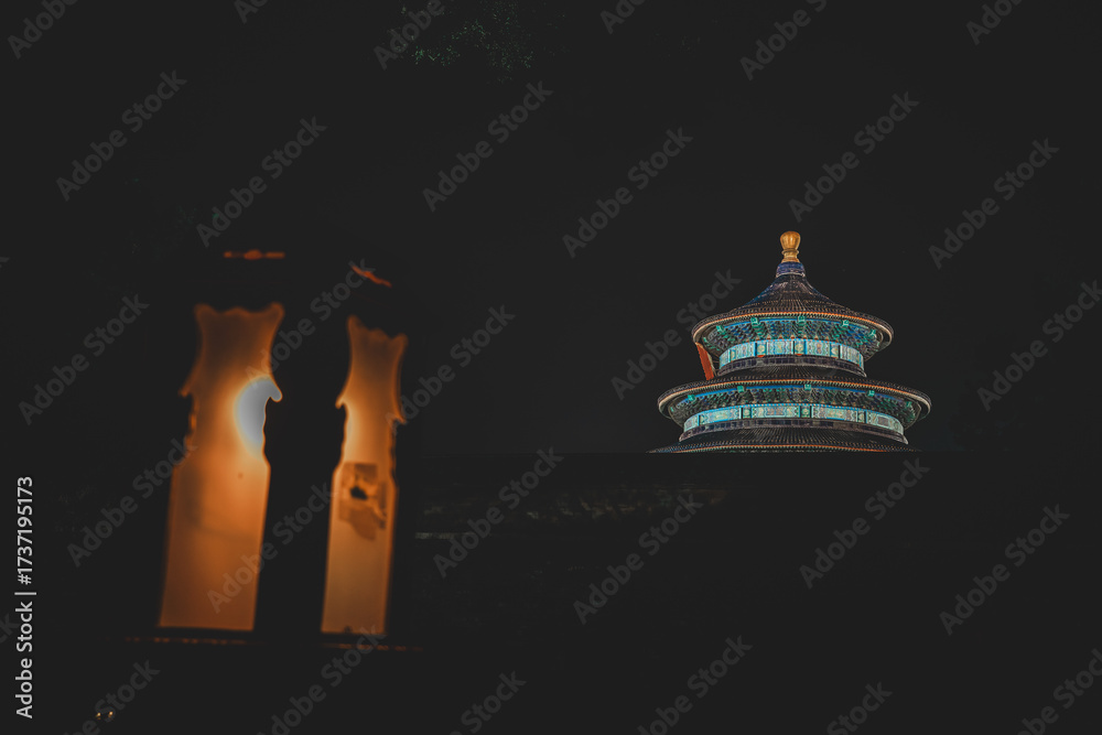 Night view of The Palace Museum in Beijing. Illuminated structures glow against a dark sky. A sense of mystery surrounds the ancient architecture.