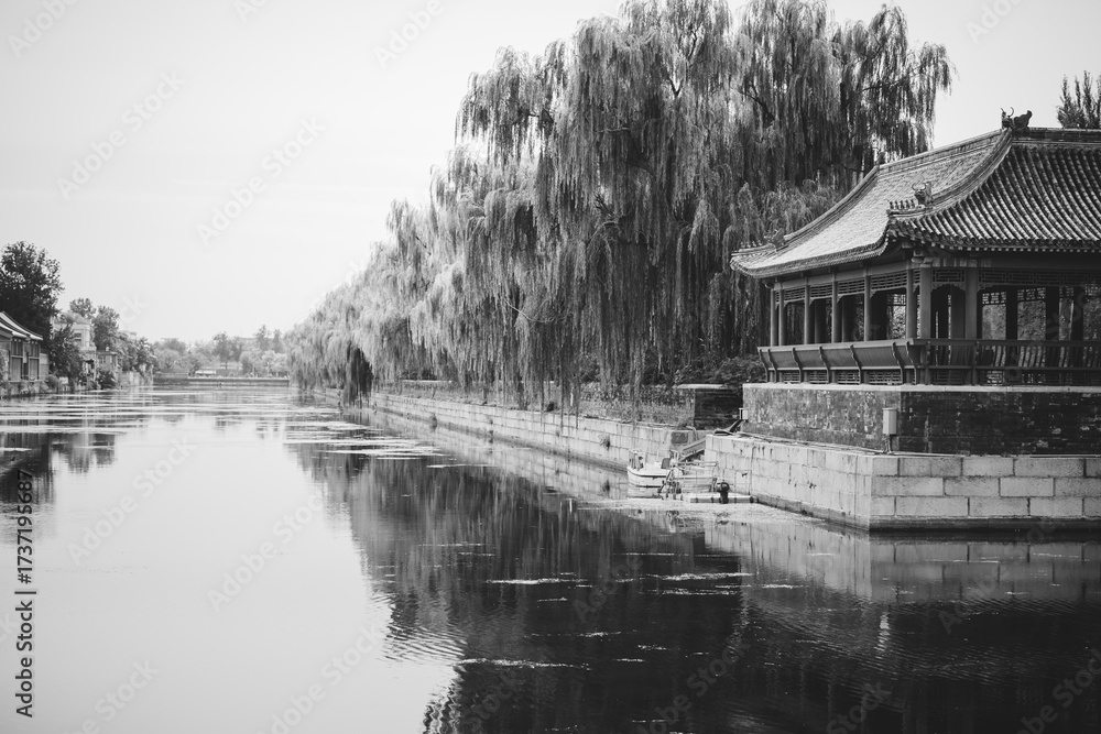 A serene monochrome view of The Palace Museum, Beijing. Reflective water mirrors the traditional architecture and weeping trees. This historical landmark evokes peace.