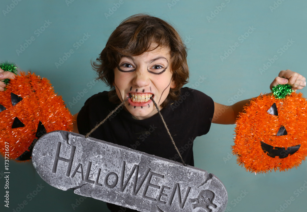 teenager boy with halloween decor pumpkin and grave stone with script close up photo