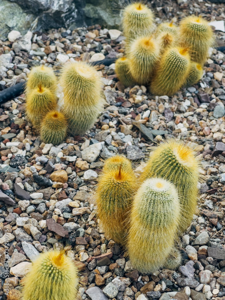 Cacti in a botanical garden. Scene features various yellowish cacti surrounded by pebbles and rocks