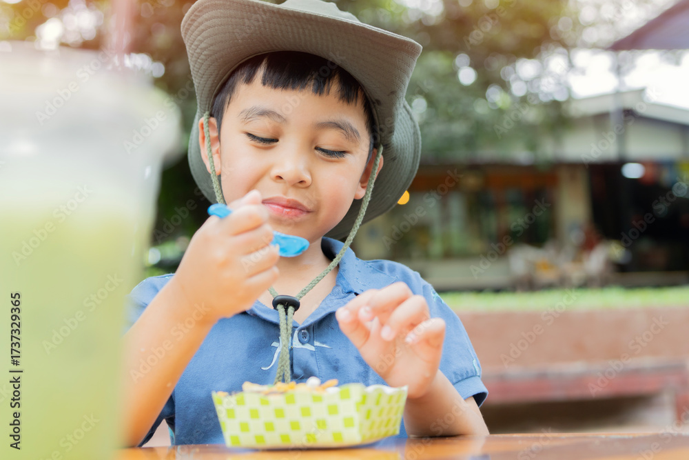 Portrait of happy Asian little boy with cowboy hat sitting on bench eating bowl of ice cream.