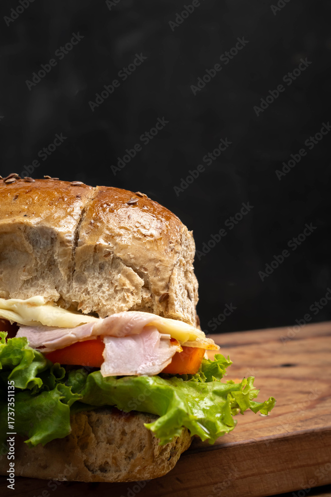 Ham, cheese, lettuce, and tomato sandwich on black bread with flax seeds on a dark background