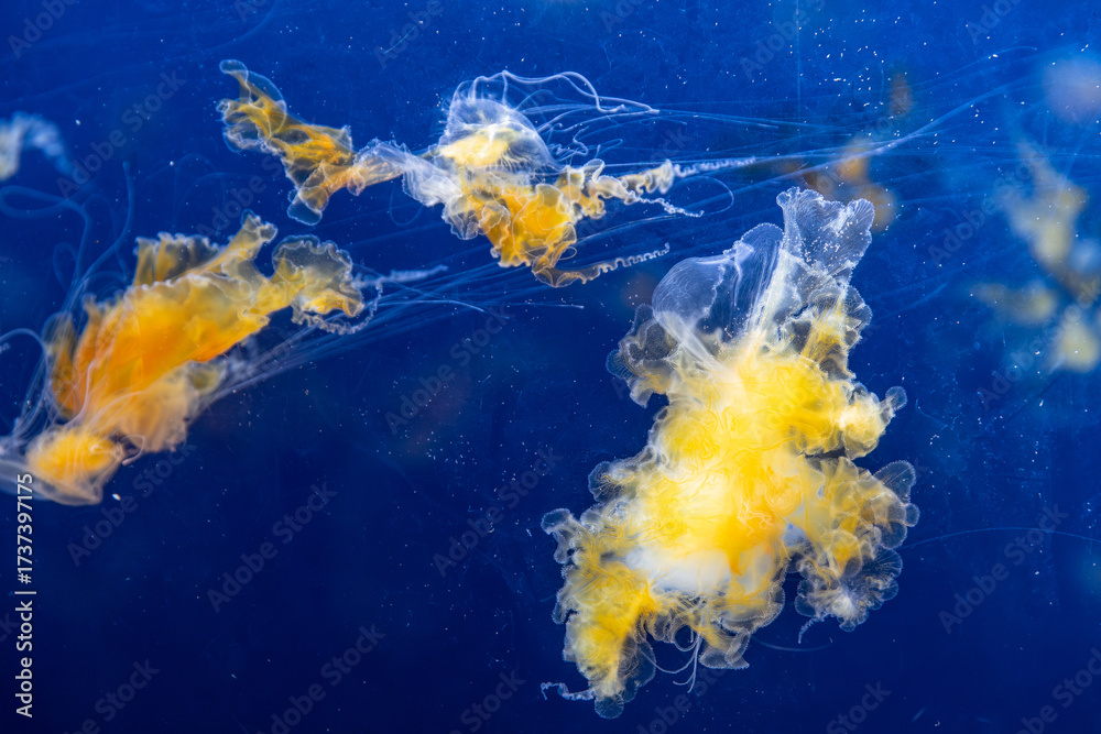 Close-up of Golden Jellyfish Floating in Blue Water, Wallpaper Background