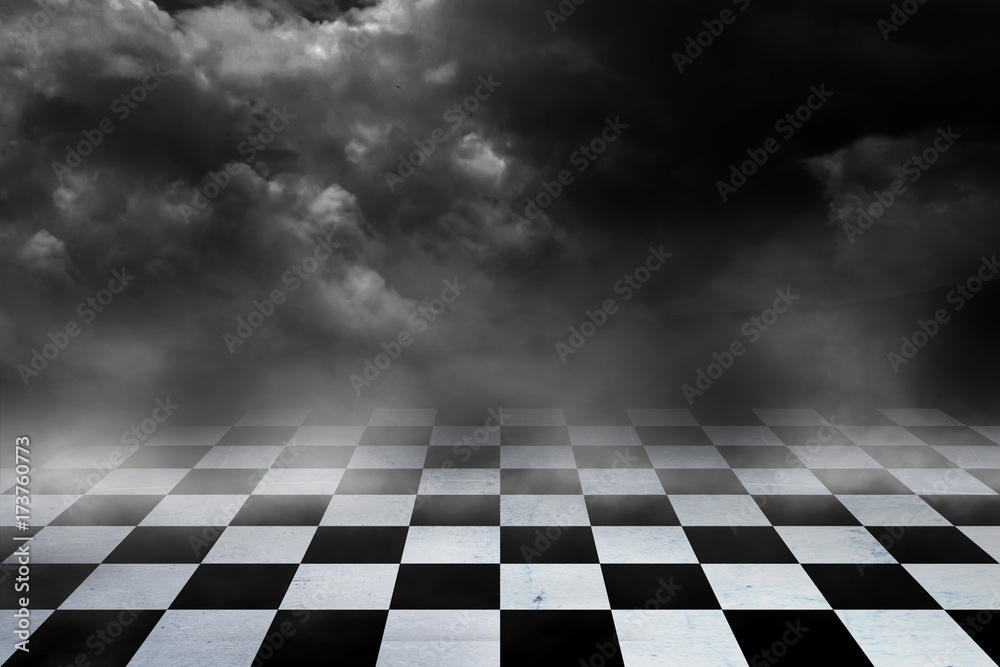 Black And White Checker floor Grunge Room. Checker floor lead into dark empty space