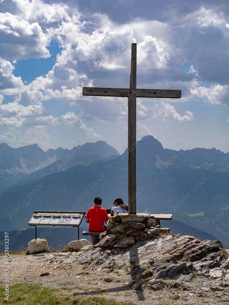 Large Wooden Cross at the Summit of Plan de Corones and a Seated Couple admiring the landscape below, Italy