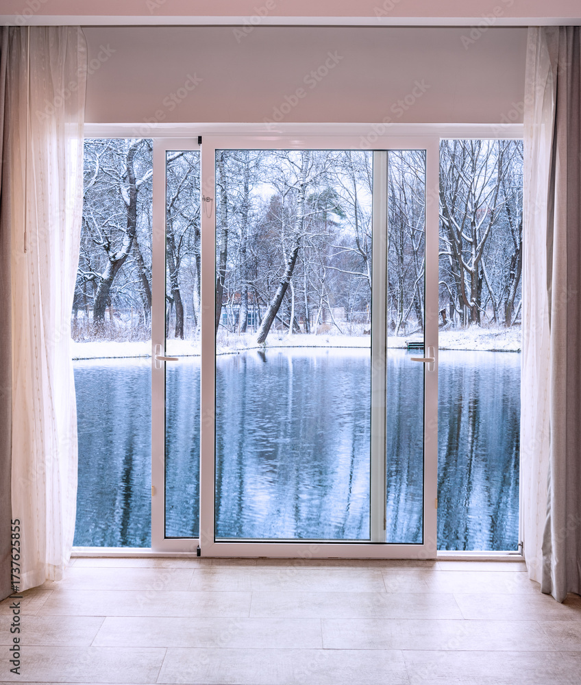 Winter landscape seen through large glass doors, showcasing a serene frozen lake and snow-covered forest. Tranquil and picturesque scene perfect for winter themes.
