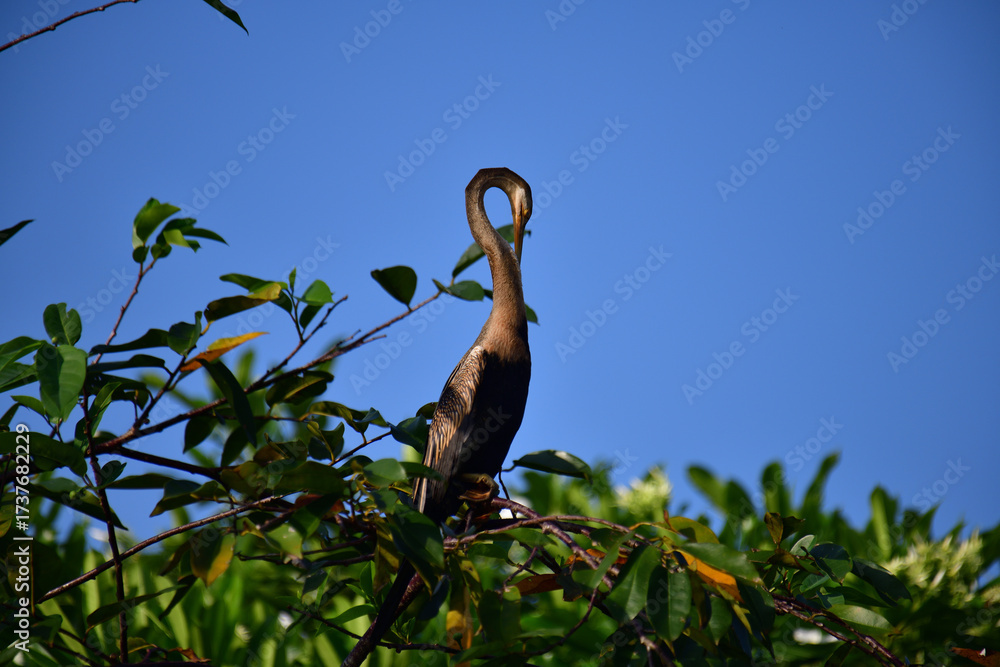 This image features an Oriental darter, or snakebird, a striking waterbird with a remarkably long, slender, S-shaped neck and a sharp, pointed bill, perched in a tree against a clear blue sky.