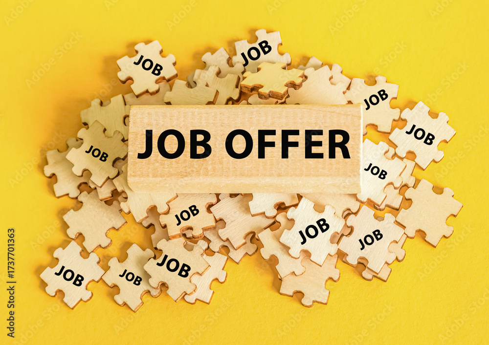text job offer. A lots of puzzles and a wooden block on a yellow background. Best offers on the labor market. Find employment. Skills, experiences and qualifications.