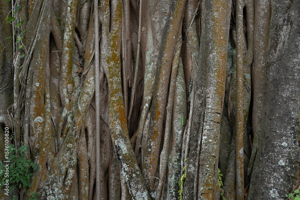 Majestic sandstone rock formations in dense pine forest under clear blue sky
