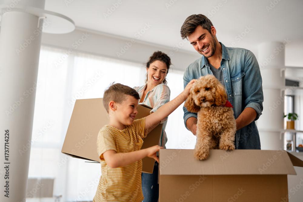 New home. Parents with child moving in new house, property mortgage and real estate investment.