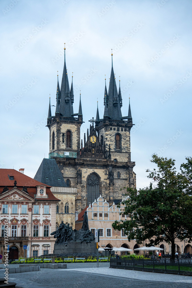 Stunning sunrise over Prague with warm golden light illuminating historic architecture, cobblestone streets, and iconic city landmarks in high-quality detail.