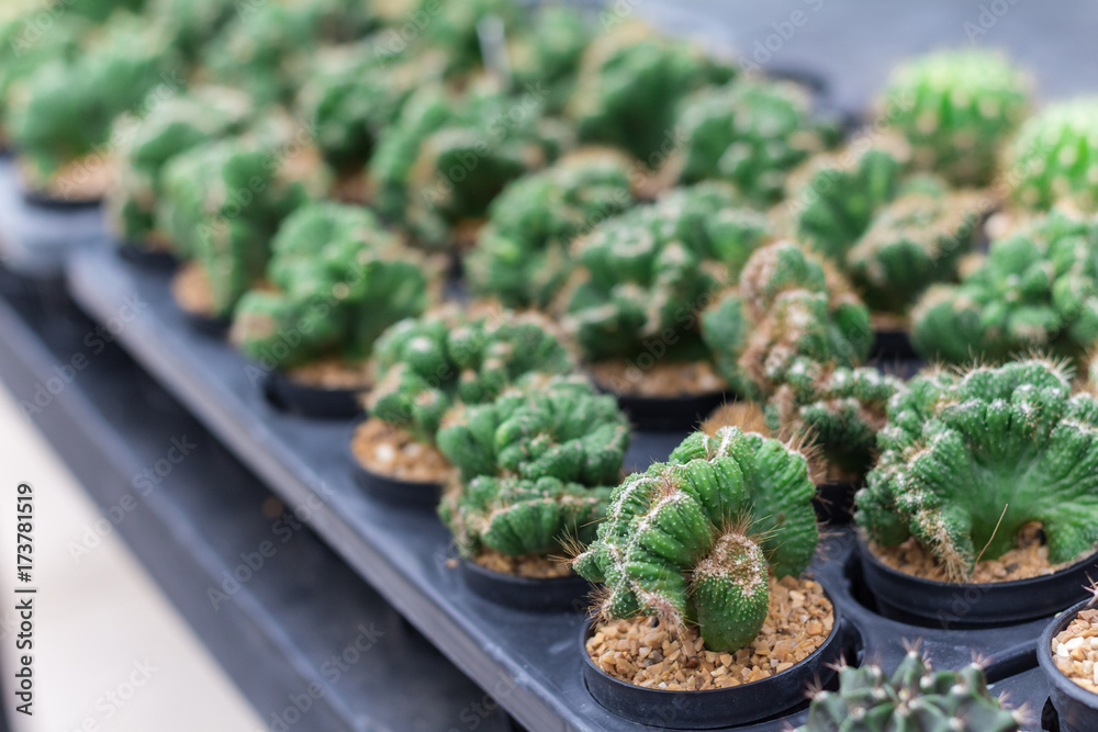Little cactus plant in flowerpot. Many cactus for garden decoration