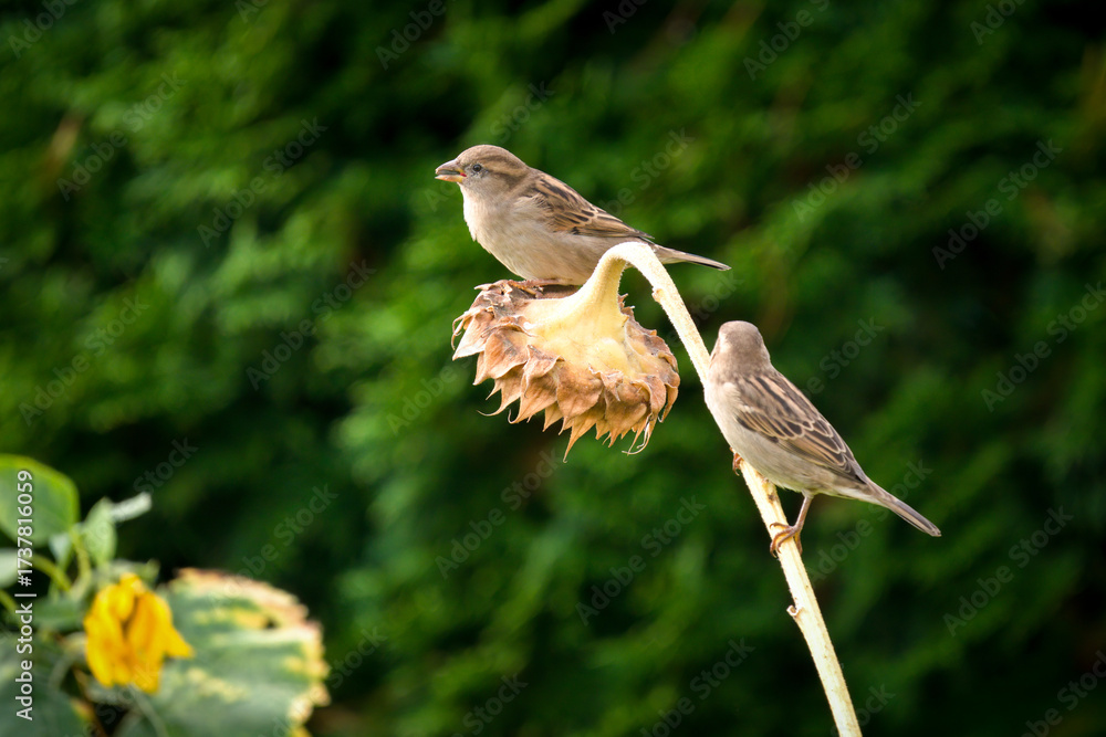 sparrow sitting on a dry sunflower and picking seeds at a autumn day