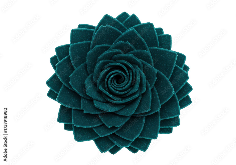 Teal flower isolated on transparent background, decorative felt rosette with spiral center for crafts and embellishments