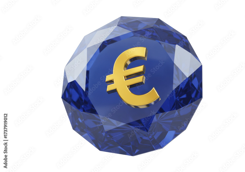Golden euro sign on a blue gemstone isolated, currency symbol on a precious stone for finance and investment concepts