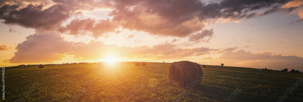 Sunset over hay bales in a field. Golden light bathes the landscape, creating a tranquil scene. For agriculture, travel and inspiring greeting card designs. Vintage film aesthetic.