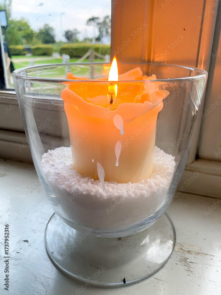 A burning candle in a glass vase on a windowsill is a decorative item and focal point.