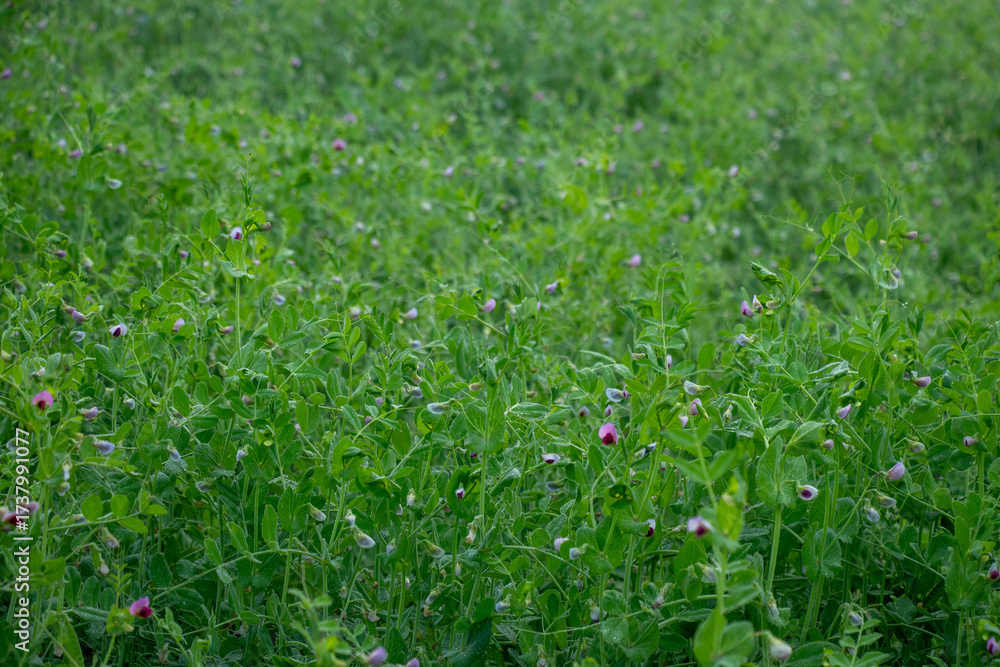Numerous pea plant blossoms a vibrant green field, morning moisture