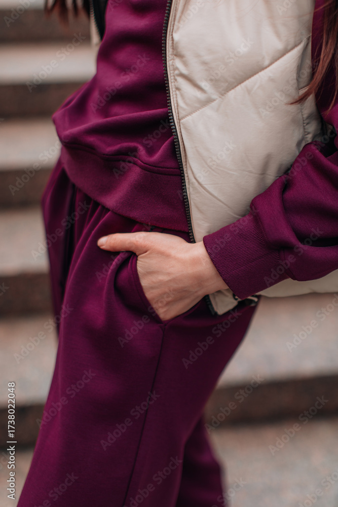 Sportswear women's streetwear, beige puffer vest and burgundy suit, autumn-winter stylish outfit