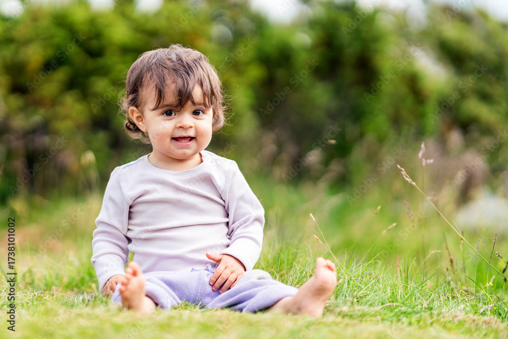 Happy toddler girl crawling and playing in the grass on a sunny day, smiling and curious. A joyful childhood moment full of innocence, discovery, and outdoor fun.