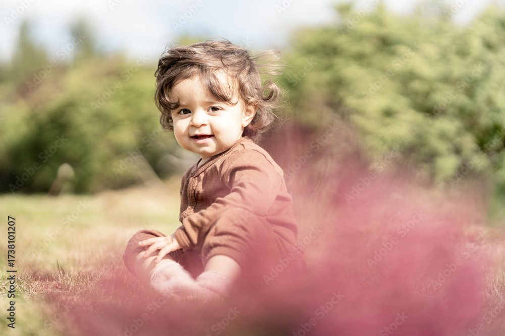 Cute toddler girl sitting among colorful autumn heather flowers, dressed warmly for fall, surrounded by vibrant purple and pink blooms, symbolizing childhood innocence, seasonal beauty.