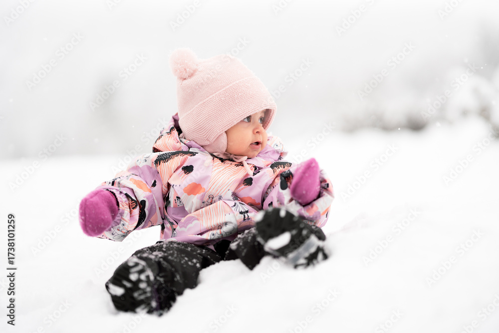 Adorable toddler girl between one and two years old exploring fresh snow outdoors, smiling and joyful in a warm snowsuit and winter hat.