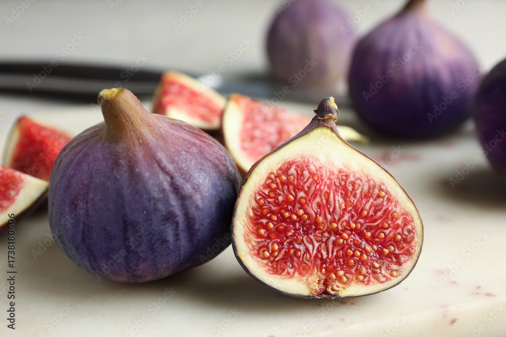 Whole and cut figs on light table, closeup