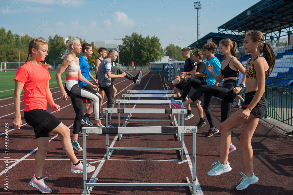 Group of young athletes practicing warm-up and leg exercises using hurdles on an outdoor running track near stadium seating.